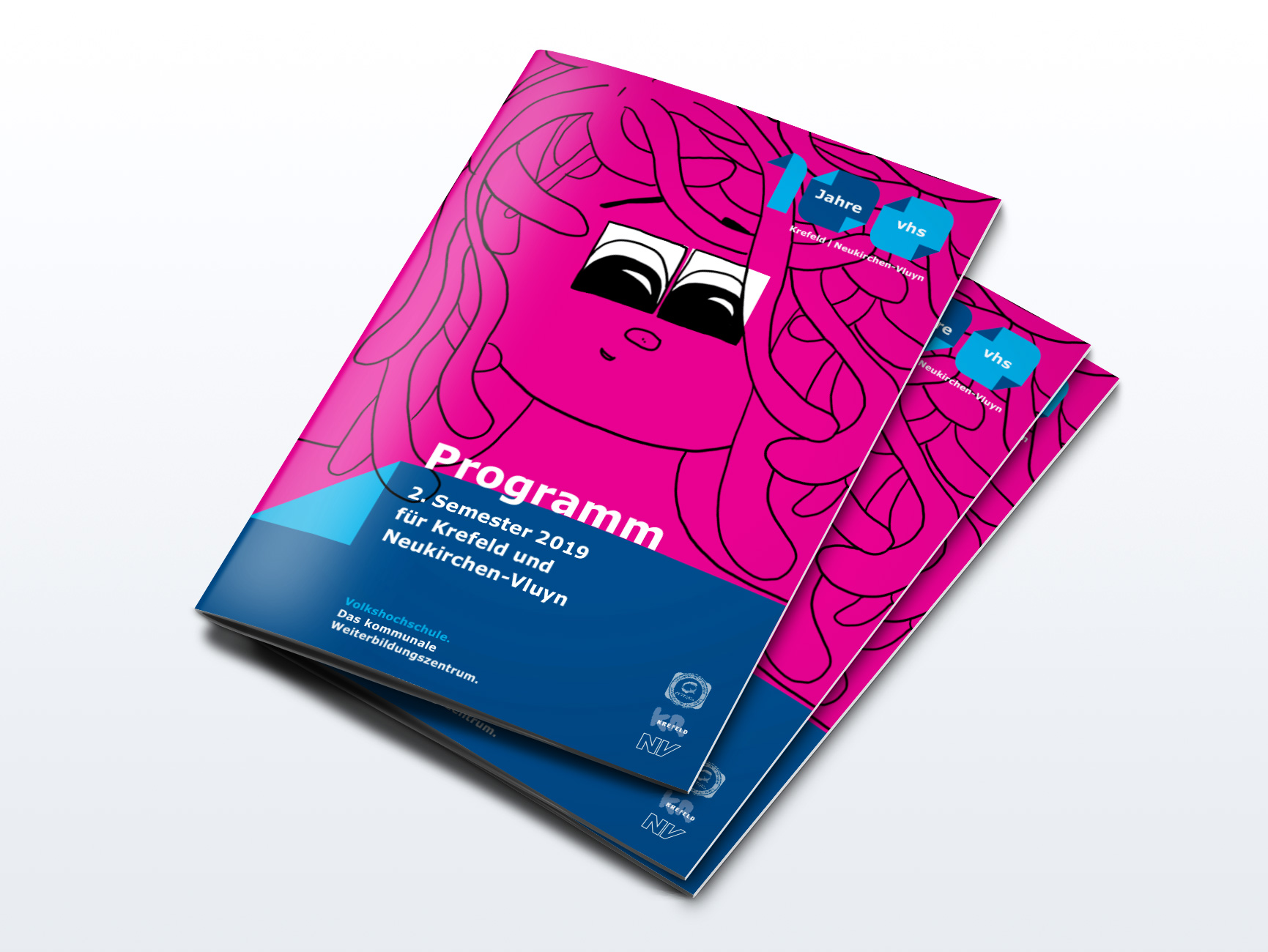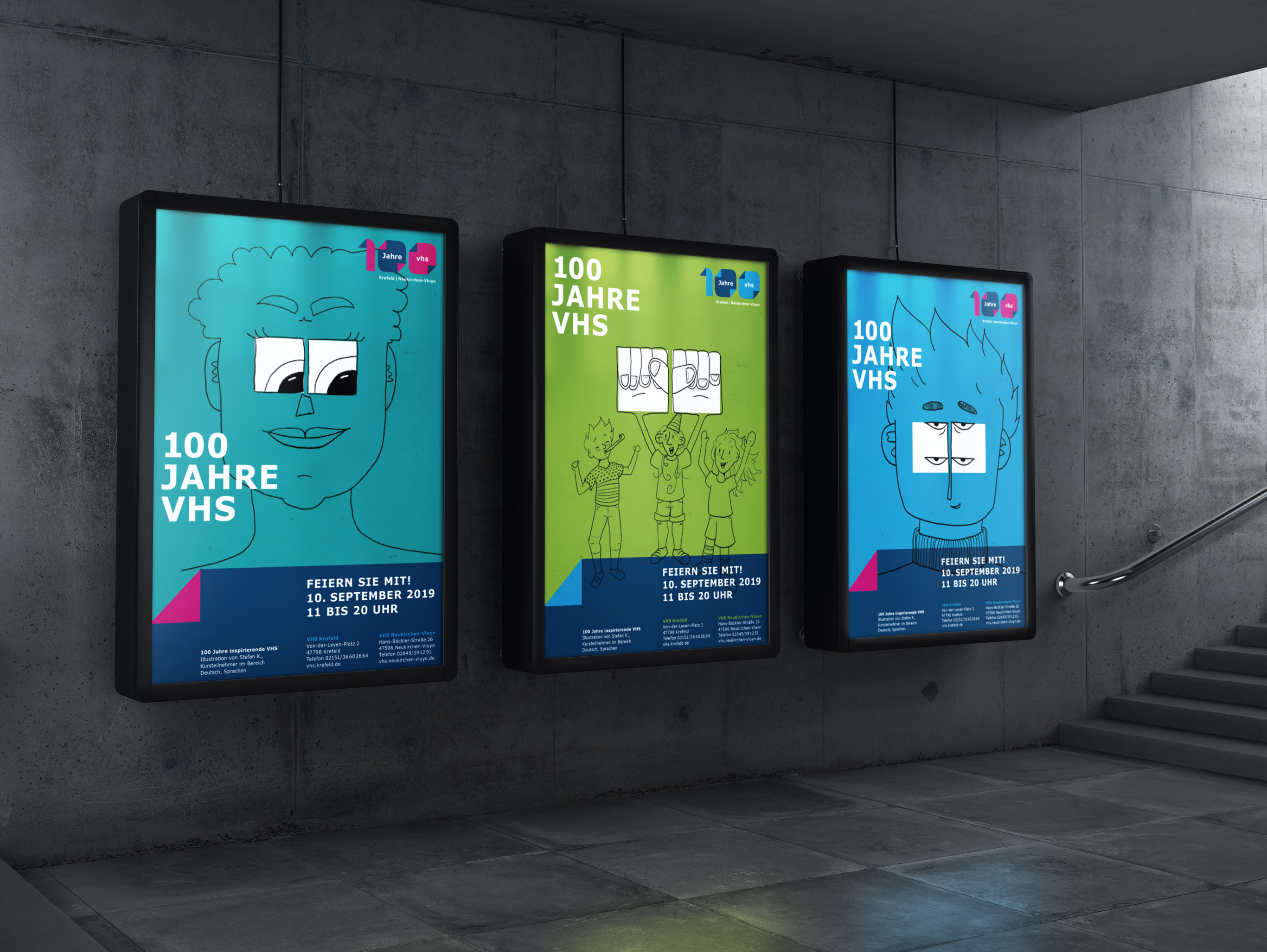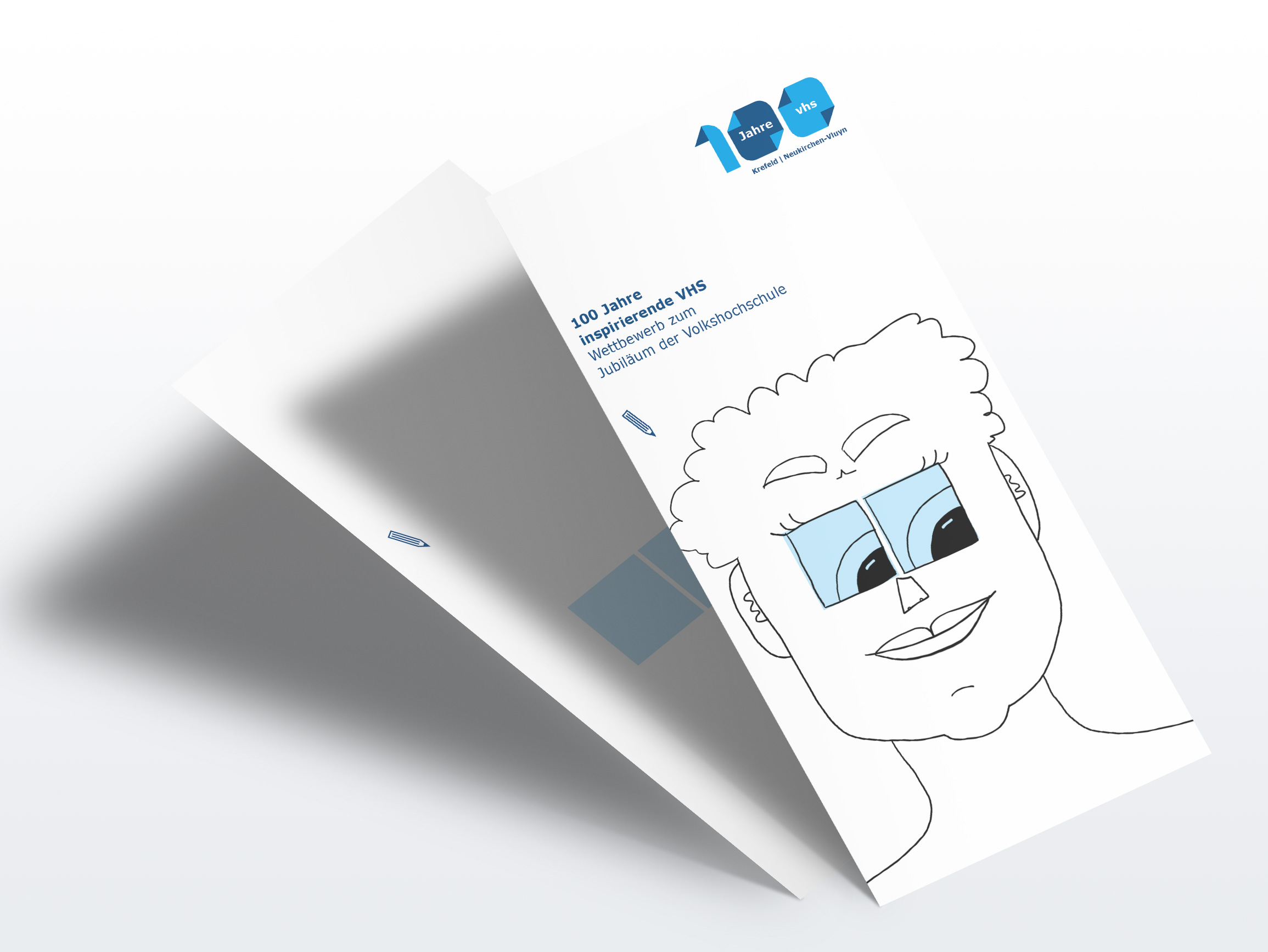 Event Communication für die Volkshochschule KrefeldDie Volkshochschule Krefeld feiert ihr 100-jähriges Jubiläum. Das soll kein Geheimnis bleiben. Ein eigenes Logo zum Jubiläum, das das eigentlich VHS-Logo zitiert, ist ein erster Schritt. Ein Mal-Wettbewerb macht die Teilnehmer zu Gestaltern des Jubiläums. Mit diesem Konzept kann die Volkshochschule Ihren Anspruch als kulturellen Treffpunkt untermauern. Für jeden der fünf Fachbereiche wird ein eigenes Piktogramm entwickelt. Die gewählte Farbigkeit greift die Farbigkeit der fünf existierenden Fachbereiche auf und knüpft so an das vorhandene Corporate Design an.