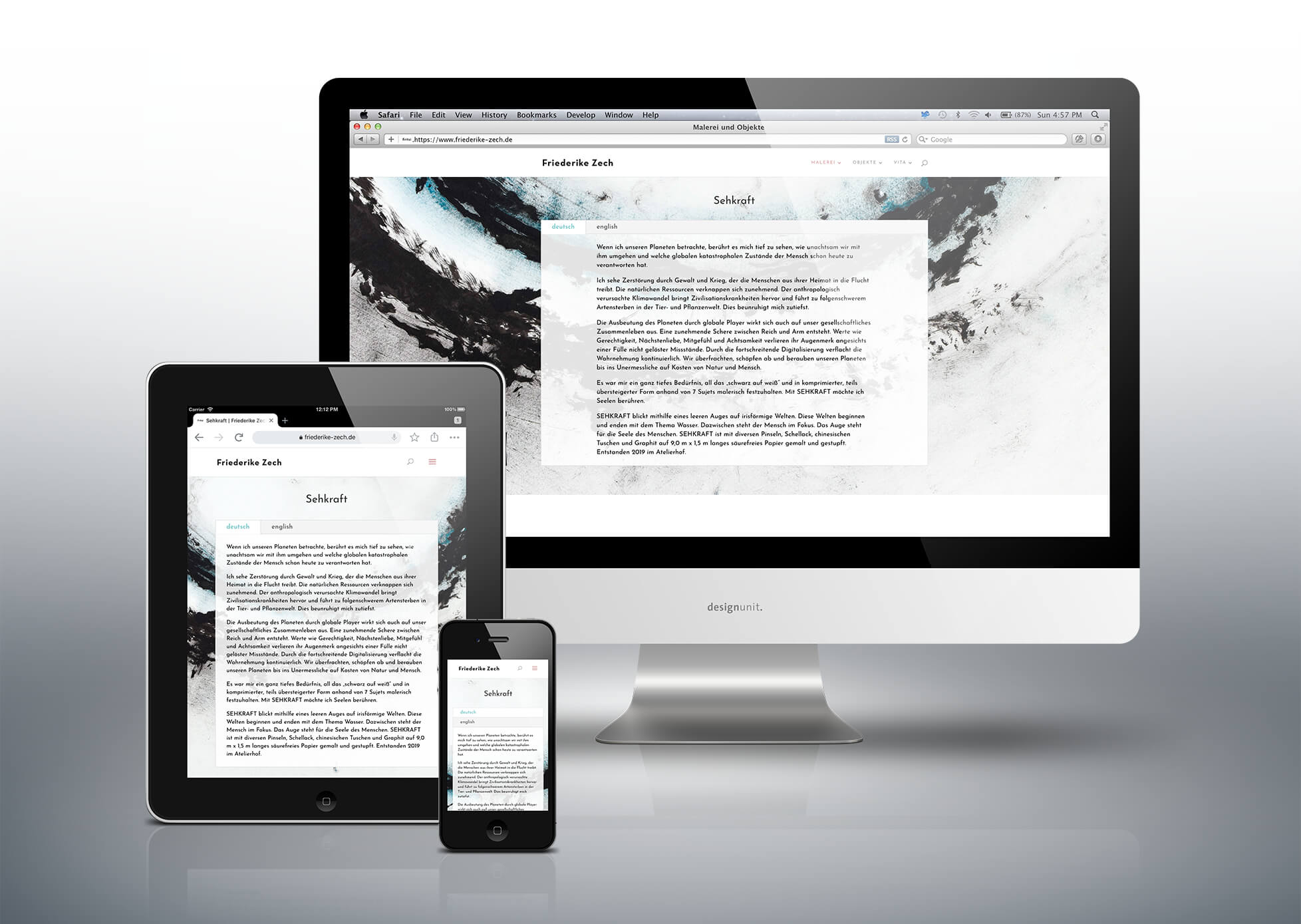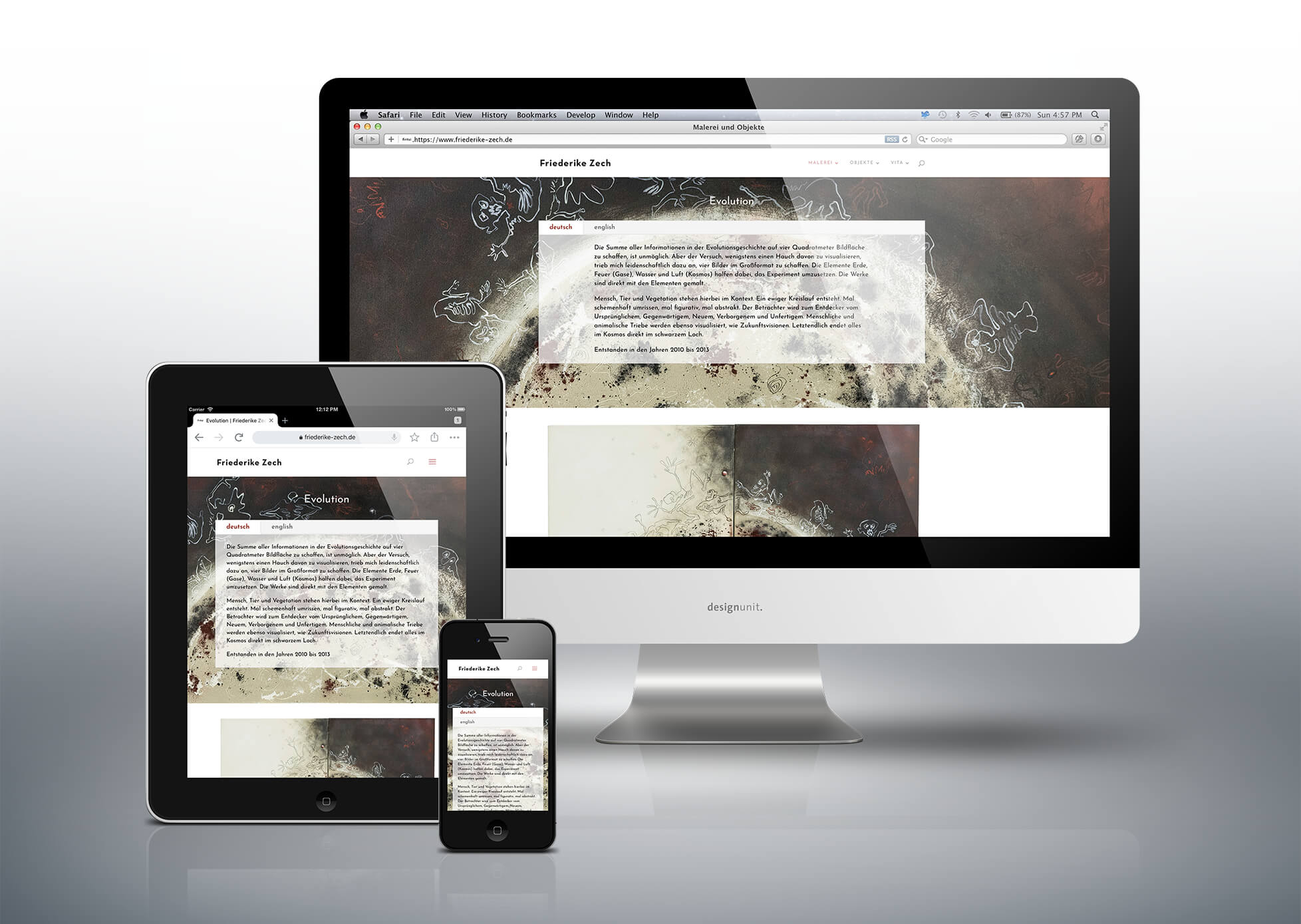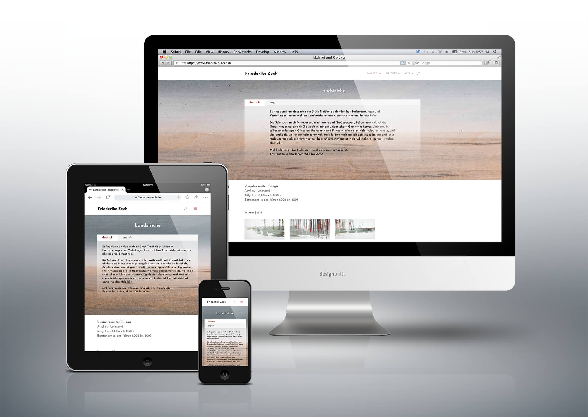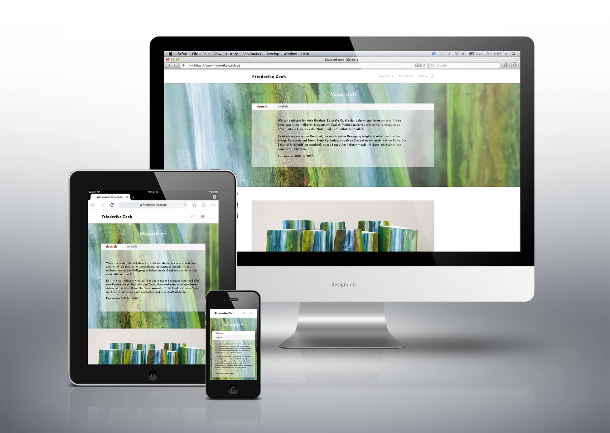 designunit realisierte für die Düsseldorfer Künstlerin Friederike Zech eine zeitgemäße, responsive Website, die es dem Besucher leicht macht, einzutauchen in das umfangreiche Werk. Das schwerpunktmäßig malerische Werk reicht von den verschiedenformatigen Landstrichen auf unterschiedlichen Hölzern bis zu den skulpturalen Wasserkraft-Werken, bei denen sie unter anderem auf Holzscheiten gearbeitet hat. Sehr originell sind auch die Upcycling-Arbeiten, die unter der Rubrik Objekte zu finden sind.