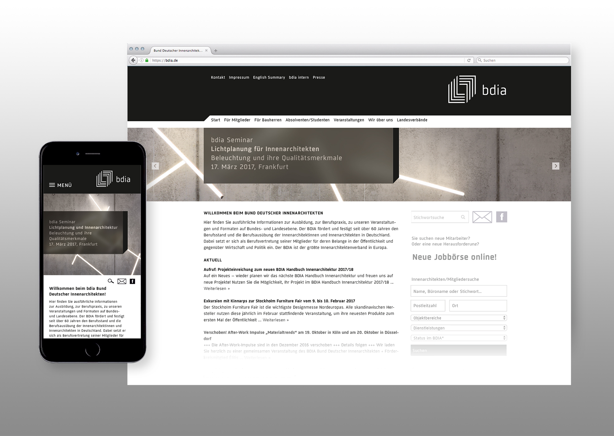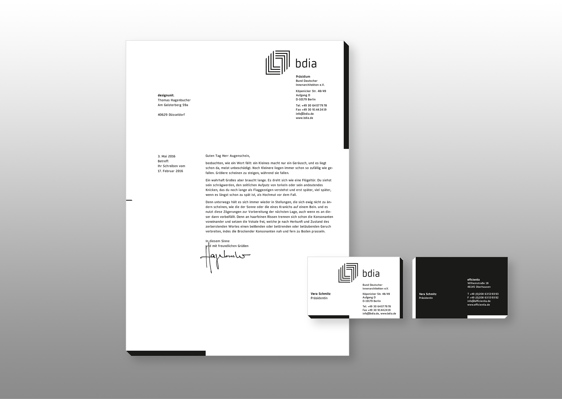 Bestehende Schwächen des BDIA-Logos, wie mangelnde Prägnanz werden durch eine Reduktion der Elemente in ihr Gegenteil verkehrt. Der Charakter des Zeichens bleibt erhalten. Der erarbeitete Wunsch nach farblicher Reduktion wird durch eine schwarz/weiß-Umsetzung realisiert.