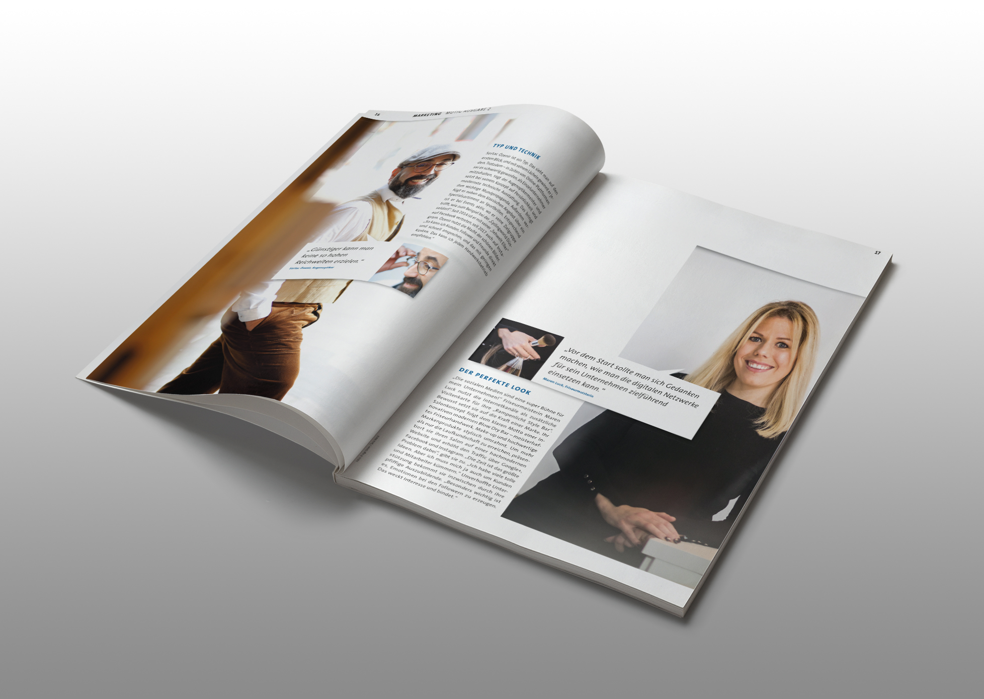 Für die Verlagsanstalt Handwerk gestaltet und realisiert designunit das Gründermagazin „MUTIG“ für den Endkunden Handwerkskammer Düsseldorf. Die besondere Herausforderung bestand darin dem Nutzerverhalten der Zielgruppe gerecht zu werden und viele kleine Informationsbausteine auf den Seiten so zu organisieren, dass die Kleinteiligkeit, großzügig wirkt.