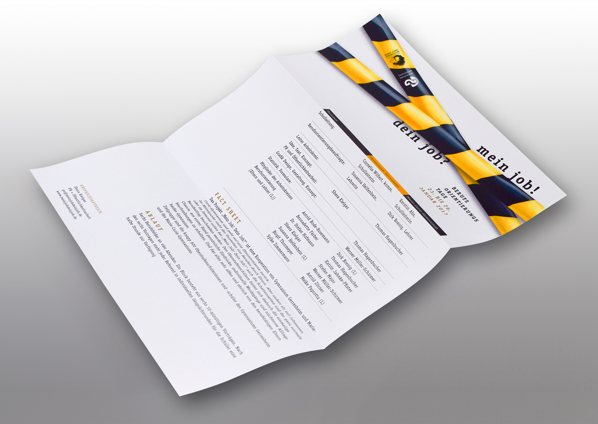 .Als die beiden Schulpflegschaftsvorstände 2015 beschließen eine gemeinsame Berufsorientierungs-Veranstaltung aus der Taufe zu heben, ist das zunächst nur eine Idee. Dieser Idee ein Gesicht, eine Form und natürlich auch einen Namen zu geben, macht sich designunit im Rahmen seines ehrenamtlichen Engagements zur Aufgabe.