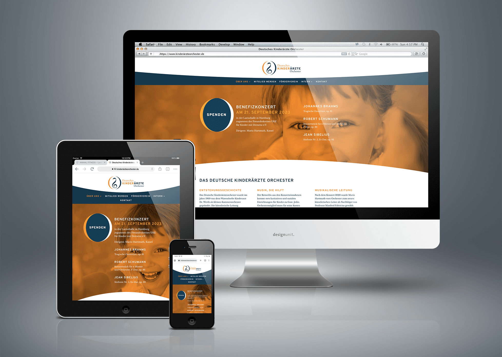 Wir haben uns sehr gefreut, als uns das Deutsche Kinderärzteorchester mit der Überarbeitung seines Corporate Designs beauftragt hat. Gemeinsam wurde ein umfangreiches Briefing erarbeitet, in dem die Ziele für das neue Corporate Design definiert wurden. Da das Orchester ausschließlich Benefizkonzerte gibt, war es für die Verantwortlichen ein großer Wunsch auf der Website möglichst einfach Geld spenden zu können. Dieser Wunsch wurde mit einem unübersehbaren Spenden-Button auf der Startseite umgesetzt. Dieser verlinkt direkt zur Spenden-Website des Benefizträgers.